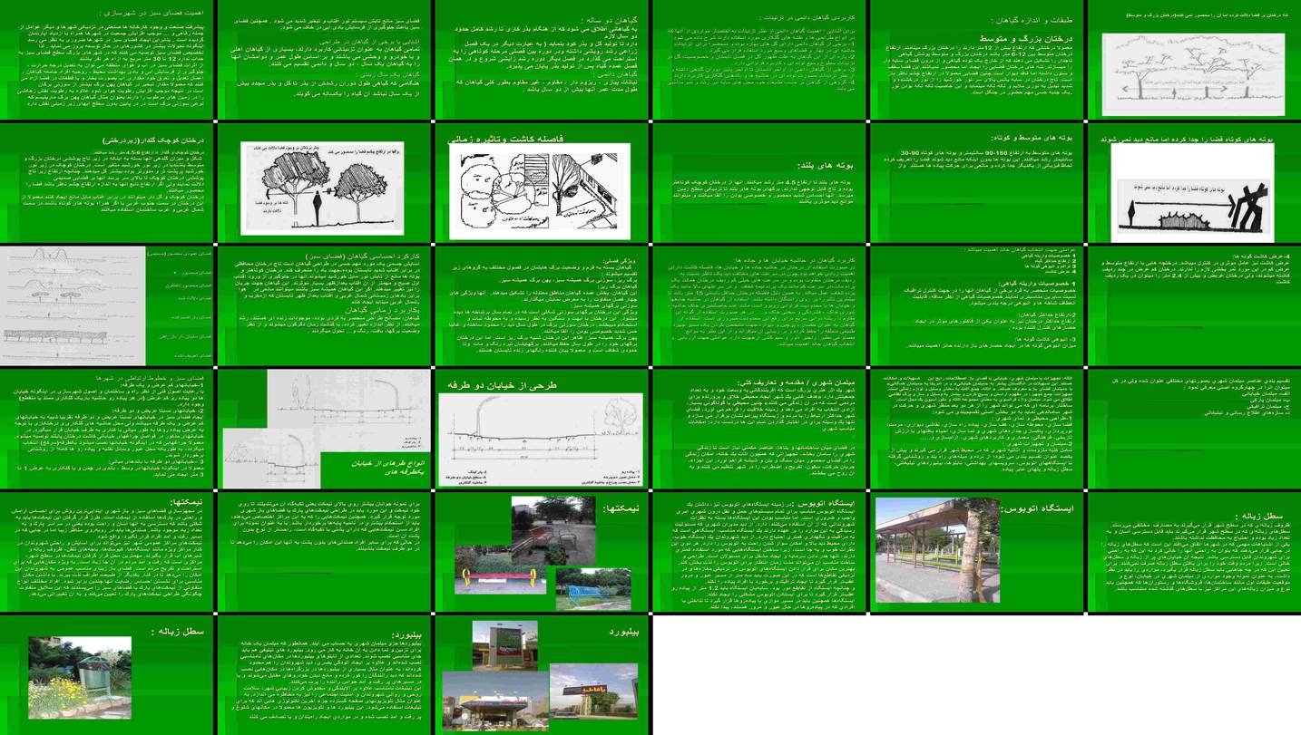 * فضای سبز و خطوط ارتباطی در شهرها (خیابانهای کم عرض و یک طرفه، خیابانهای نسبتا عریض و دو طرفه، خیابانهای دو طرفه با باندهای میانی)